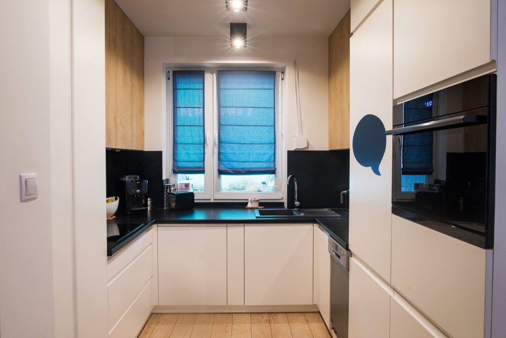 Bucataria este dispusa in forma de U, un colt cu toate cele necesare pentru prepararea mancarii. Dimensiunile reduse au facut ca fiecare latura sa fie valorificata, iar blatul de lucru le uneste pe toate cele trei. Electrocasnicele sunt incorporate pentru a pastra amenajarea cat mai unitara si compacta. Dulapurile superioare merg pana la tavan, asigurand astfel o zona extinsa pentru a depozita diferite lucruri necesare in bucatarie.