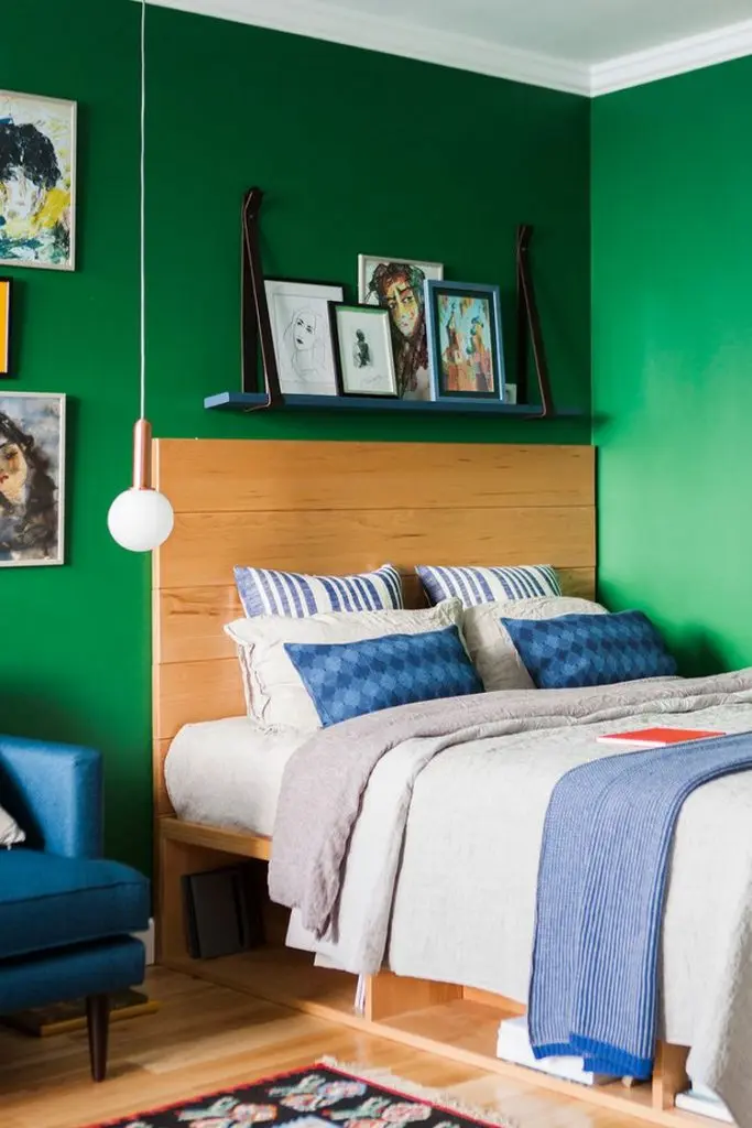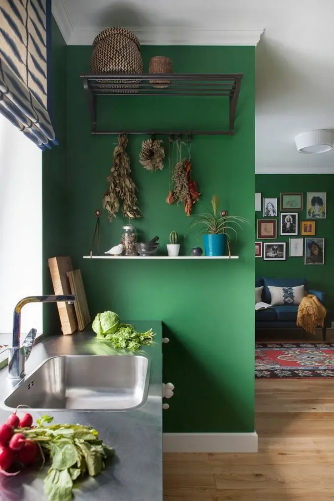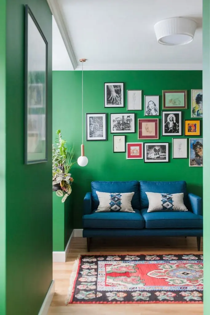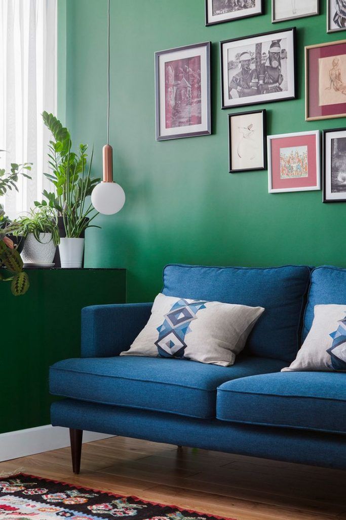 Neconventionalul este omniprezent in acest spatiu: de la pereti zugraviti cu un verde puternic, la o sofa albastra, la placi de faianta negre in zona bucatariei pana la covorul tip kilim din camera si jumatate de baie albastra.