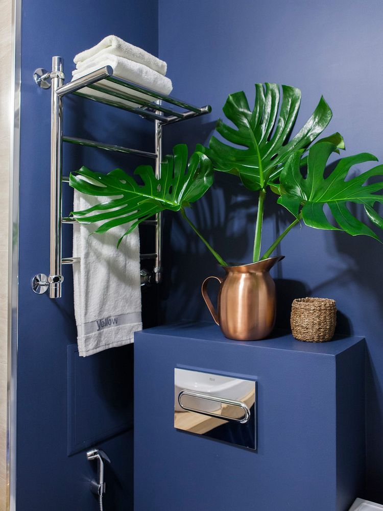 Amenajarea din baie a pornit de la pardoseala existenta formata din placi decorative de gresie. Le-au pastrat si au adaugat placi bej pentru zonele de stropire din jurul cazii si a lavoarului. Pentru cealalta parte s-a folosit o vopsea mata intr-o nuanta saturata de albastru. Tot aici a fost integrata si masina de spalat rufe. Chiar langa baie, designerul a prevazut si o zona cu dulapuri pentru depozitarea lucrurilor mai voluminoase, inclusiv a hainelor.