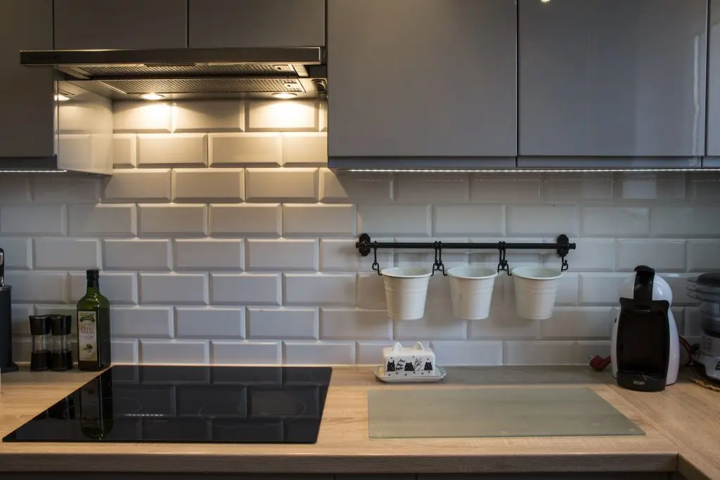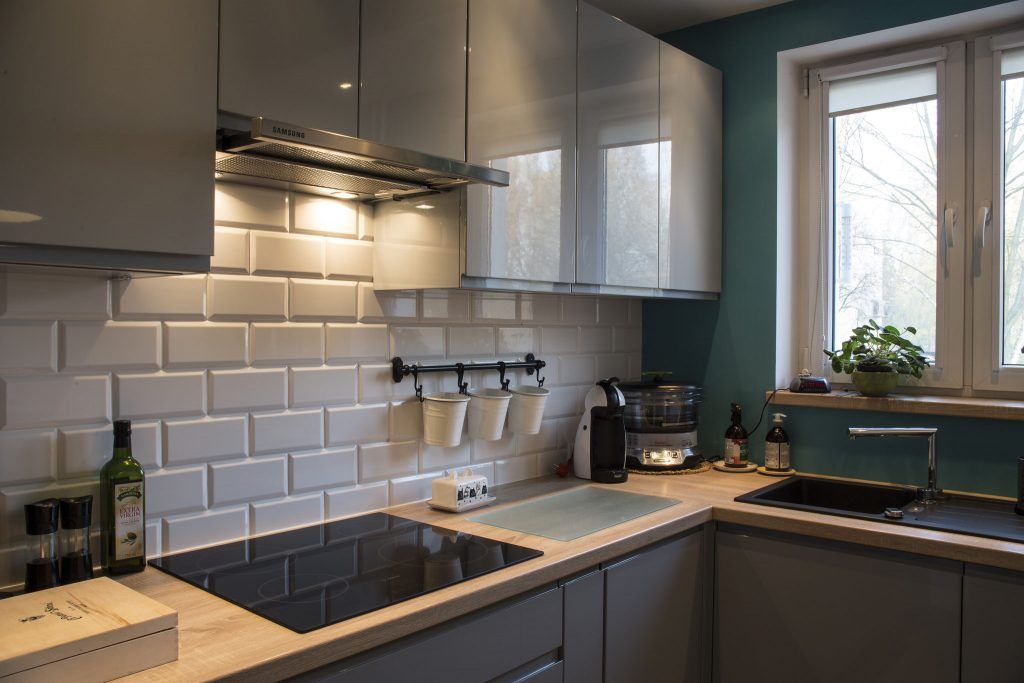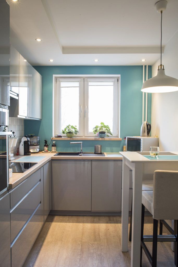 In bucatarie, mobilierul alb lucios aduce un plus de luminozitate spatiului si accentele de turcoaz il inveselesc. Spoturile asigura un iluminat uniform, iar corpul supradimensionat suspendat deasupra mesei aduce plusul de lumina necesar atunci cand se gateste sau atunci cand beneficiarii iau masa.