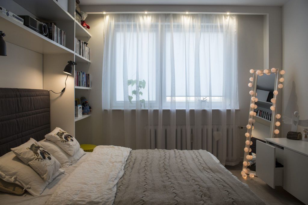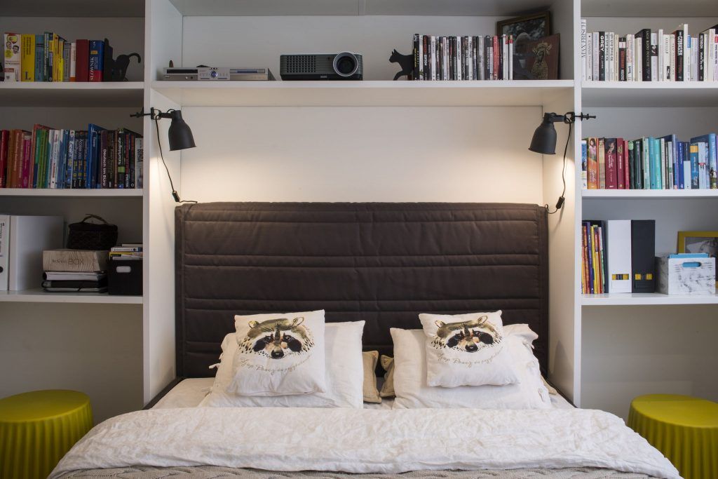 Patul este incadrat de un corp realizat special pentru a asigura suficient spatiu pentru depozitare chiar daca ne aflam intr-o camera de mici dimensiuni. Decorul este simplu si se bazeaza pe o cromatica neutra, cu putine insertii de culoare sau elemente de decor care indraznesc sa il scoata din monotonie.