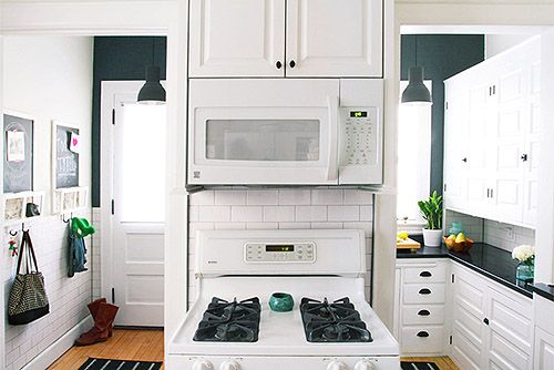 Alte cateva elemente sparg decorul predominant alb: corpurile de iluminat, covorasele, caloriferul vopsit si el in negru si chiar picioarele de la scaun. Atentia pentru detaliu primeaza in fiecare colt al bucatariei. Pentru a sparge monotonia alb-negru, in partea destinata servirii mesei, a fost introdus o portiune de perete tip caramida alaturi de rafturi din lemn.
