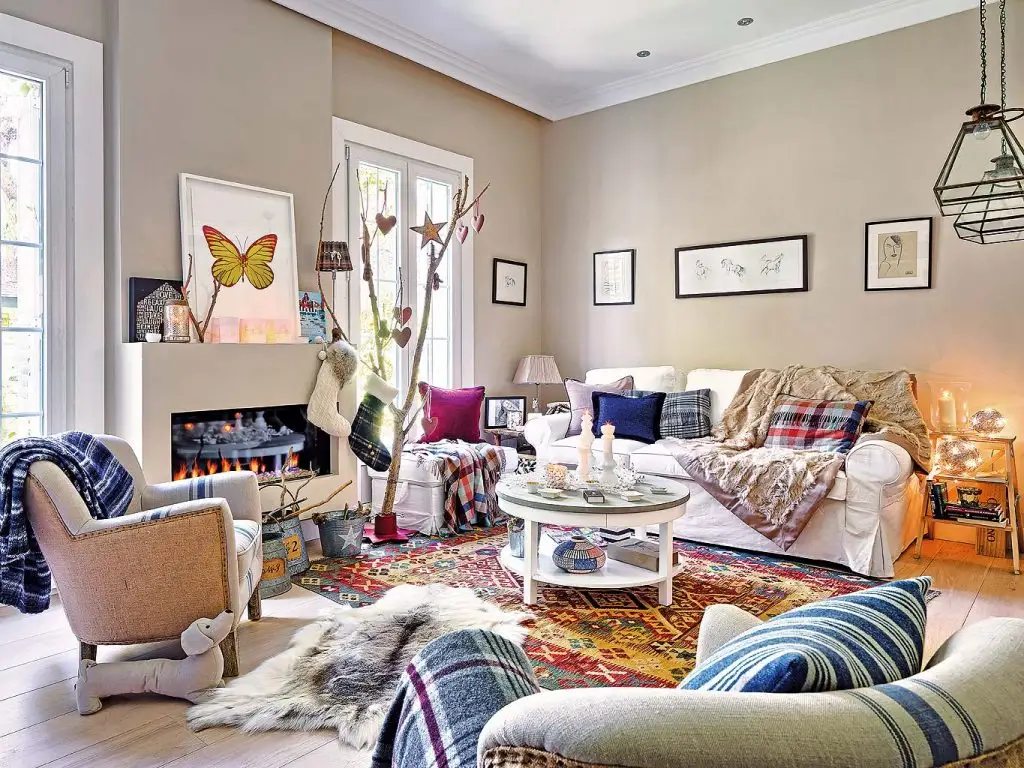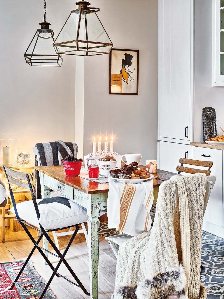 Cu siguranta te-a atras si restul decorului. Totul iti inspira caldura si starea aceea de bine pe care o ai cand esti inconjurat de toti ai tai dragi si te pregatesti sa iei masa. Conturat intr-un minunat stil rustic-chic, detaliile se armonizeaza placut cu atmosfera de sarbatoare din fundal. Pernele decorative, pledurile pufoase sau blanitele de pe pardoseala parca te imbratiseaza.
