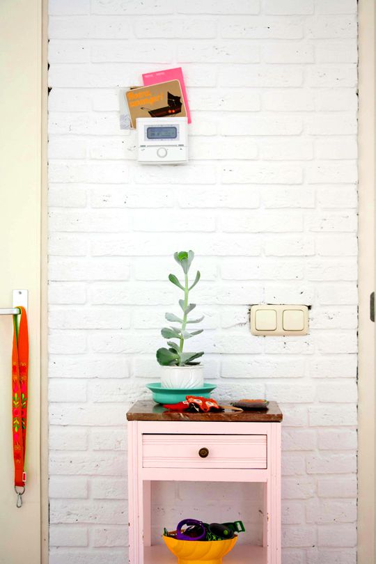 Chiar si mesele auxiliare prezente in living au fost alese cu multa grija si afectiune. Aceasta masa vintage colorata in roz pastel inveseleste orice colt de camera. Camera copilului este perfecta prin simplitatea pe care o emana. Un perete verde-menta adaposteste decorul si mobilierul in stil scandinav. Dormitorul cuplului pastreaza aceeasi cromatica asaltata de culoare si o reprezinta aici printr-un tapet plasat pe peretele din spatele patului. Colturile peretilor au fost decorate in mod magic cu diverse tablouri inspirate din povestile copilariei.