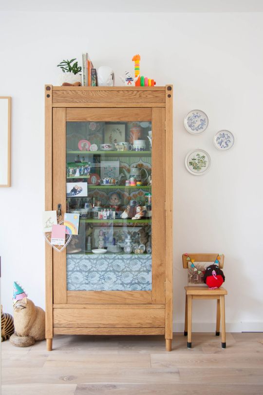 Acest dulap a primit un aspect delicios prin adaugarea unui strat de hartie cu model pe placajul interior. Toate elementele asezate pe rafturile dulapului sunt armonizate perfect cu ansamblul de obiecte decorative prezente in casa.