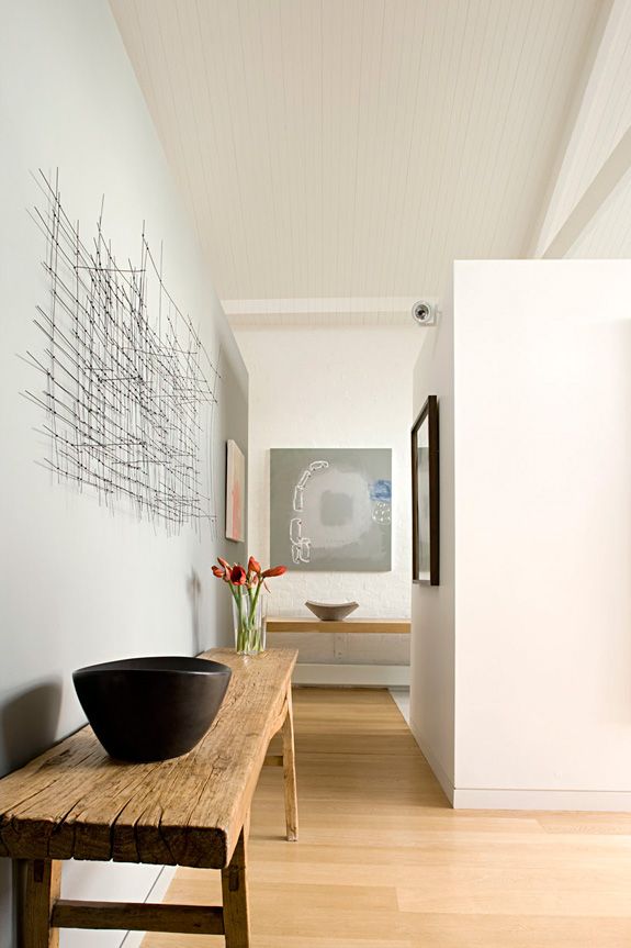 Modernitatea isi pune puternic amprenta prin tablouri si prin sculpturi perfect inglobate in camerele largi, deschise si puternic luminate natural. Din loc in loc, au renuntat la netezimea peretilor imaculati si au ales sa pastreze textura naturala a caramizilor pe suprafete reduse pentru a crea puncte focale pentru anumite obiecte sau colturi de incapere. Baile pastreaza aceeasi caramida, varuita in alb, completata de geamurile tip solz care asigura o aerisire excelenta. Stilul abordat in grupurile sanitare este unul minimalist, o continuare fireasca a restului casei.
