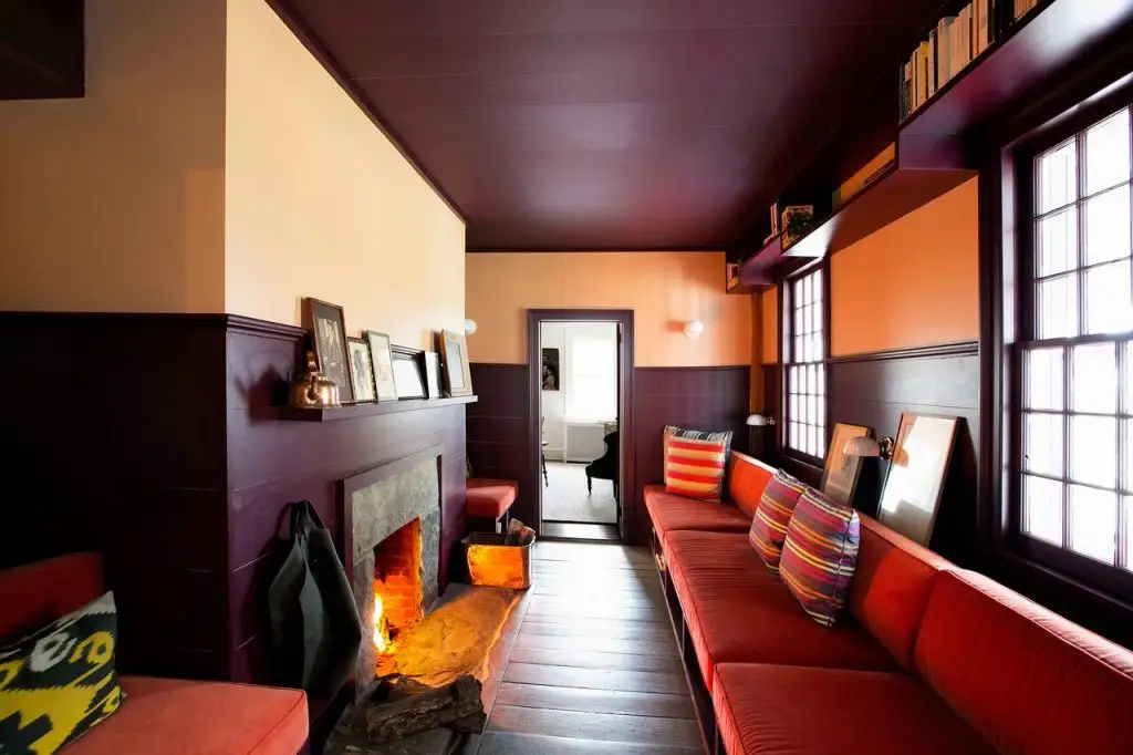 Camera destinata studiului este extrem de armonios realizata din punct de vedere cromatic. Bancheta din catifea completeaza cromatic caldura redata de focul din semineul de pe perete.