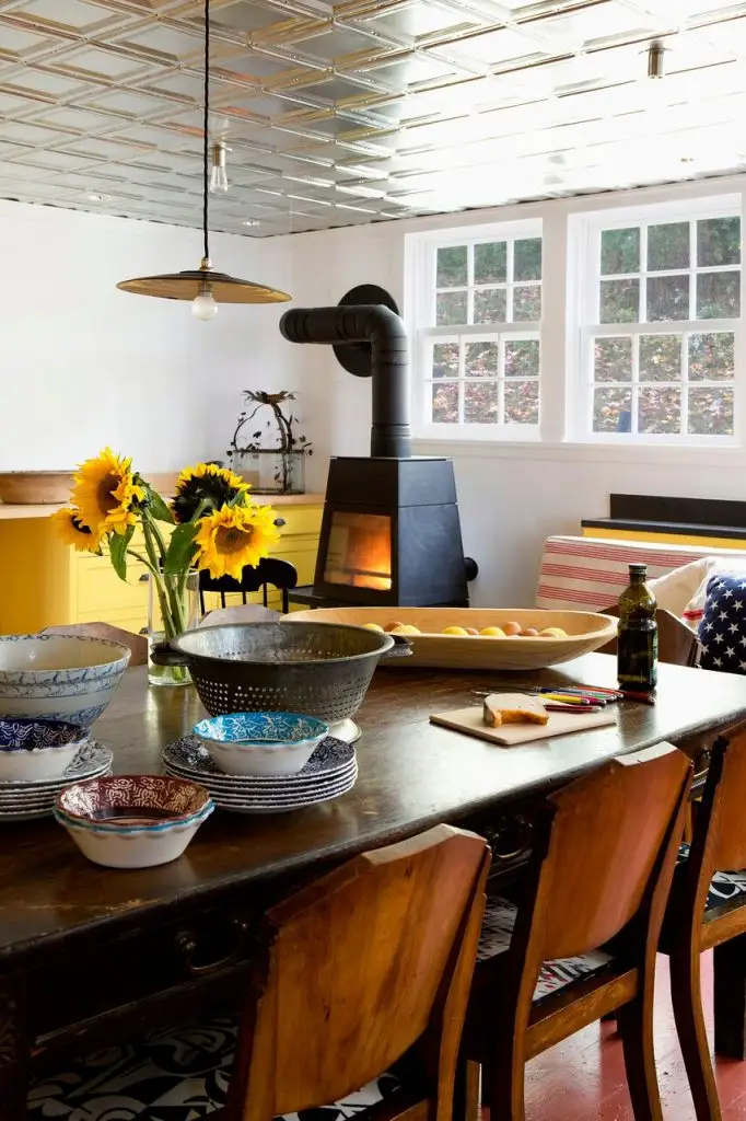 Fotoliile in stil scandinav sunt o mostenire de familie, iar masa din lemn masiv este o bijuterie a familiei ce reflecta lumina care patrunde in zona bucatariei si a diningului. Soarele patrunde mai putin in aceasta zona, de aceea a fost nevoie de potentarea efectului de luminozitate cu niste perdele din catifea in culoarea galben-acid.