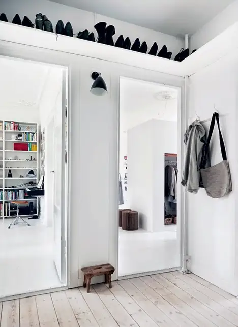 Si pentru ca am pomenit de depozitare, un detaliu interesant de remarcat este felul in care designerul a ales sa aseze incaltamintea: in hol, pe o etajera lunga cat peretele, situata deasupra usilor de la intrarea in camere.