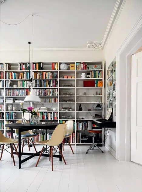 Albul intens deschide mult perimetrul locuibil, il face luminos si mai spatios. Insertiile de negru aduc un strop de dramatism in decor, iar elementele din lemn, inclusiv podeaua dintr-un lemn deschis la culoare, imblanzesc putin monocromatismul culorilor. Biblioteca din living e punctul de atractie si pata de culoare a camerei alaturi de masa neagra asortata cu scaune tip Eames.