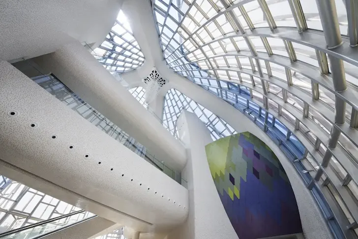 Imbracat intr-o serie de petale de metal, interiorul si exteriorul sau sunt acoperite in gresie mozaicata pusa manual care creeaza un gradient de culoare de alb la bej si roz inchis accentuat de lumina colorata. Un candelabru de aproximativ 7 metri suspendat atarna in centrul cladirii precum pistilul unei flori.