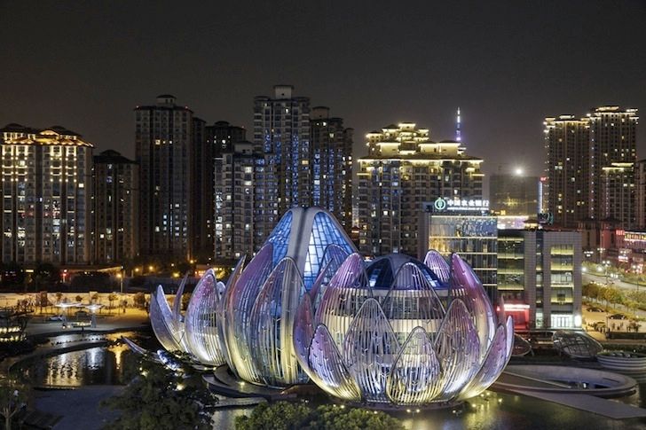 Inspirata de floarea de nufar, unul dintre simbolurile cele mai cunoscute ale culturii chineze, aceasta cladire culturala in forma de floare se ridica dramatic dintr-un lac artificial din orasul Wujin, China si prezinta cele trei stadii ale dezvoltarii florii, de la boboc pana la inflorirea completa.