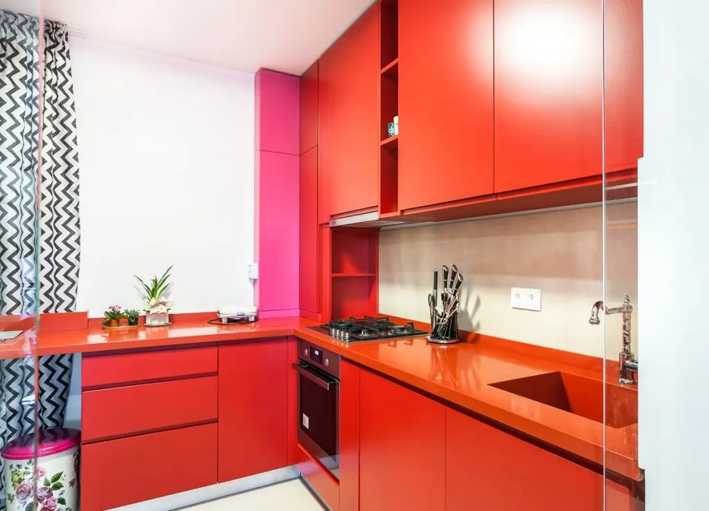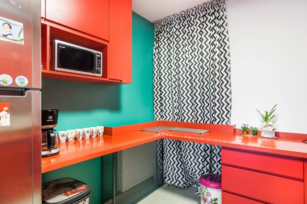 Probabil cea mai rosie bucatarie din lume, iata cum descrie echipa de laCorespaceaceasta amenajare. Proiectul a luat nastere gratie unor beneficiari curajosi, mai exact, o familie cu doi copii, care si-au dorit un camin foarte colorat.