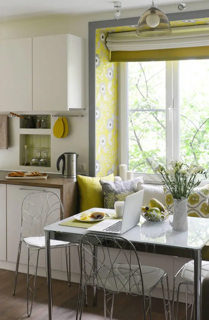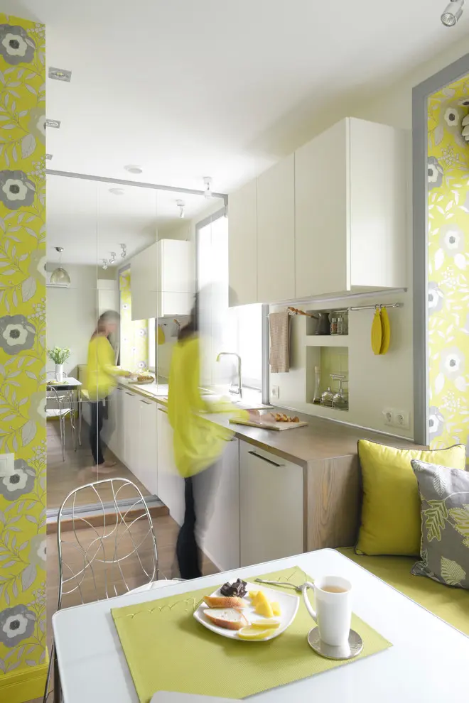 Bucataria, desi am putea sa-i spunem mai degraba chicineta, este excelent conturata in contextul spatiului. Intr-un plan deschis ce comunica cu camera, dispunerea paralela a mobilierului ofera si spatiu pentru gatit, dar si pentru depozitat. Peretele placat cu oglinzi reuseste sa ofere profunzime spatiului si mai ales sa creeze iluzia ca bucataria pare, de fapt, mai mare. Electrocasnicele sunt incastrate pentru un plus de unitate, iar albul mobilierului precum si lumina naturala amplifica intr-un mod fericit spatiul. Si pentru ca orice casa are nevoie de un loc pentru luat masa, iata-l si aici, ingenios amenajat in continuarea bucatariei. Practic, mobilierul bucatariei se prelungeste sub forma unui divan la fereastra si a unui corp cu sertare. In acest fel, spatiul primeste mai multe zone de depozitare, dar si loc de sezut in jurul mesei.