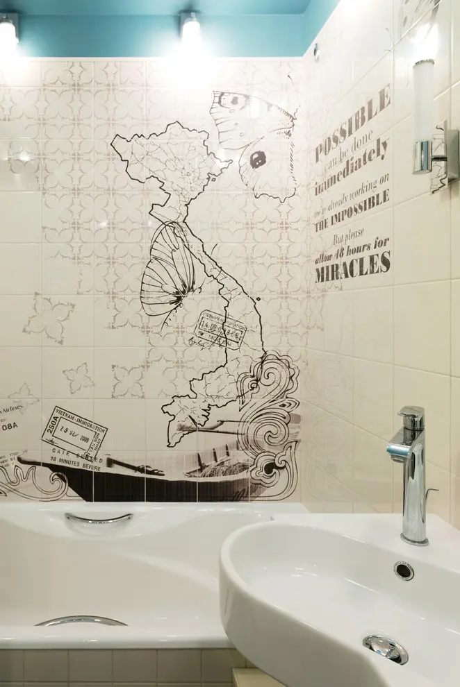 Nu putem ignora nici baia. Aici, tavanul albastru-turcoazcu siguranta te va surprinde. In plus, colajul de pe perete marcheaza una din cele mai frumoase calatorii realizate de tanara.
