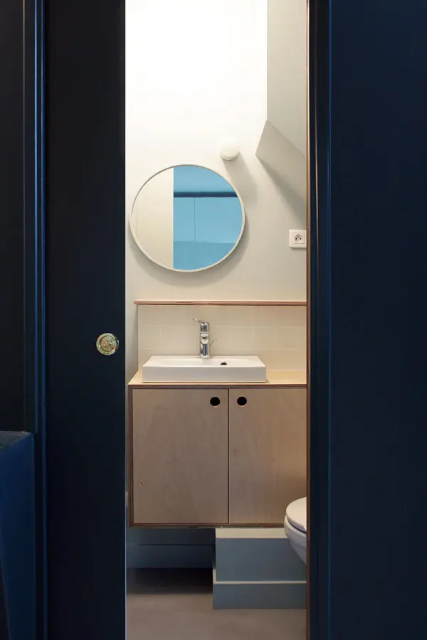 Spatiul baii a fost marit, iar langa aceasta a fost construit un mic birou care primeste suficienta lumina naturala de la iluminatorul din partea dreapta. O sectiune a masutei de cafea completeaza peretii exteriori ai baii, fiind vopsiti in bleu marin.