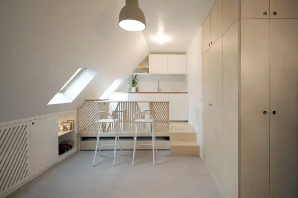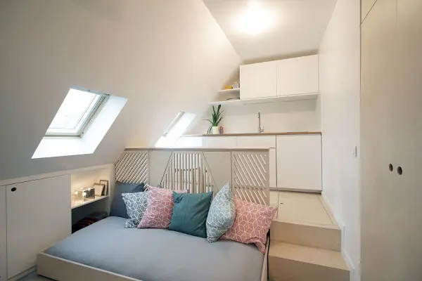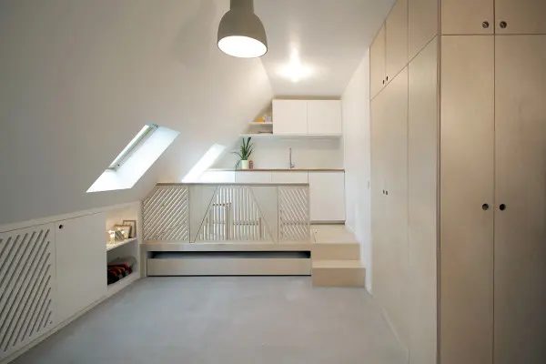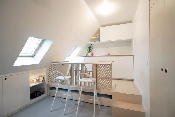 Datorita sistemului de montare a patului pe roti, acesta poate fi folosit la fel de bine ca o canapea pentru living sau poate disparea complet pentru a beneficia de maximul de spatiu disponibil in mansarda. Astfel, masa extensibila din bucatarie poate acomoda cu usurinta patru persoane atunci cand patul dispare in raftul din platforma.