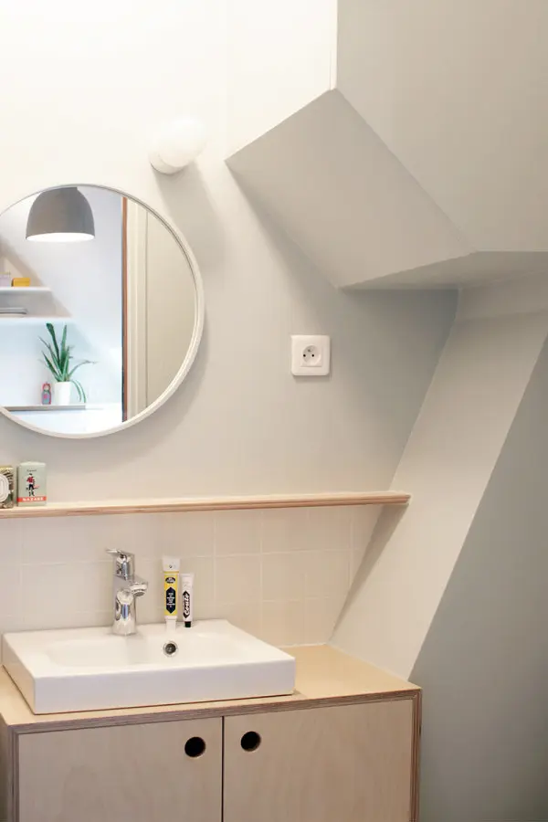 Abundenta spatiilor de depozitare ar putea trece usor neobservata in aceasta mansarda. Deschizaturile pe diagonala realizate in usile dulapurilor contribuie la iluzia de spatialitate pe care acestea o dau locuintei.
