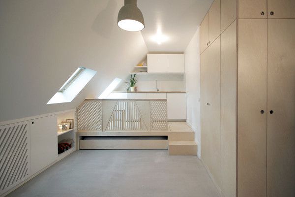 Deschide GaleriaPartitia mansardei a fost eliminata, iar spatiul a fost transformat intr-un open space cu cateva zone bine delimitate. Astfel, bucataria apartine spatiului deschis, singurul element de separare fiind platforma in care patul poate fi depozitat pe care a fost ridicata tablia patului.
