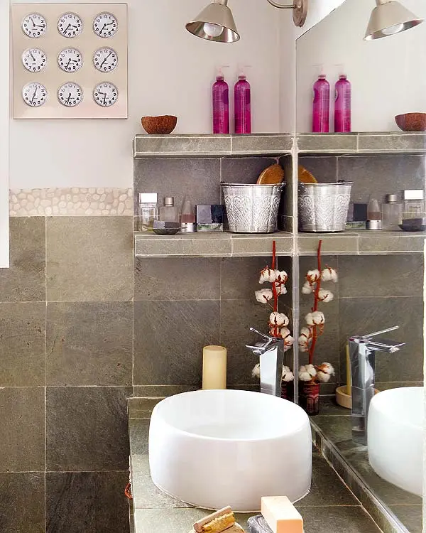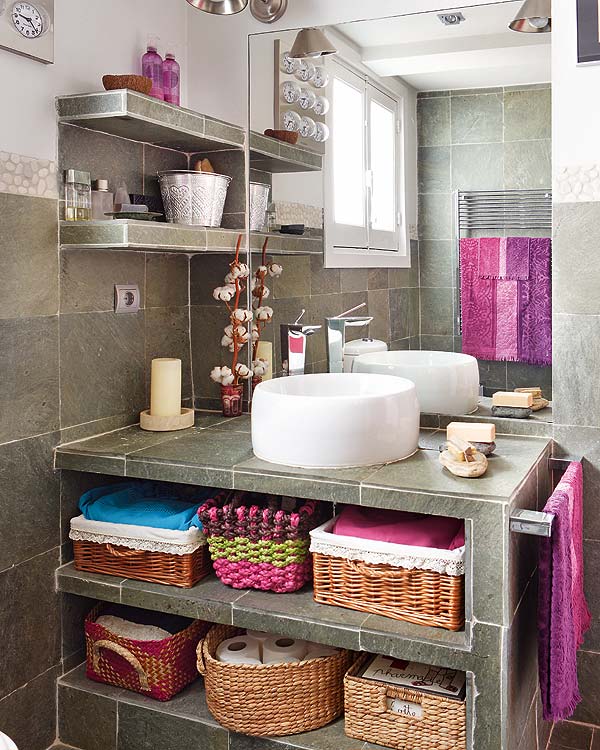 O baie cu spatii de depozitare extrem de eficiente si bine organizate