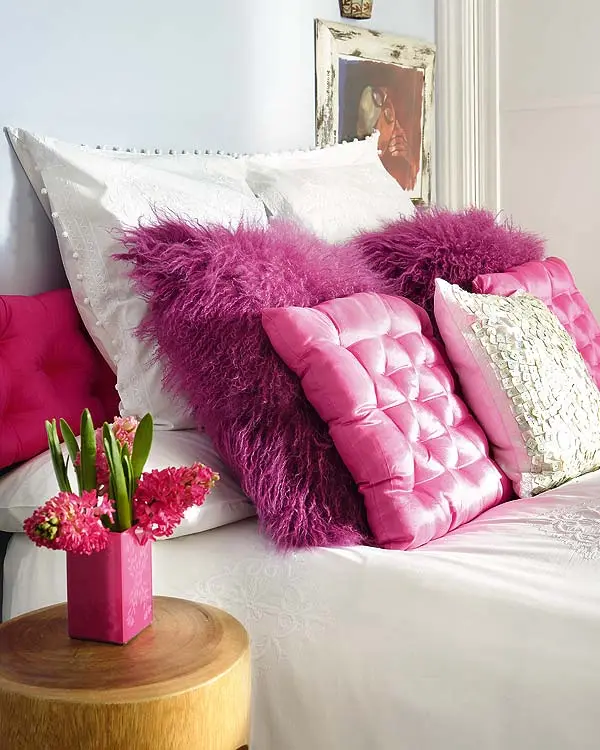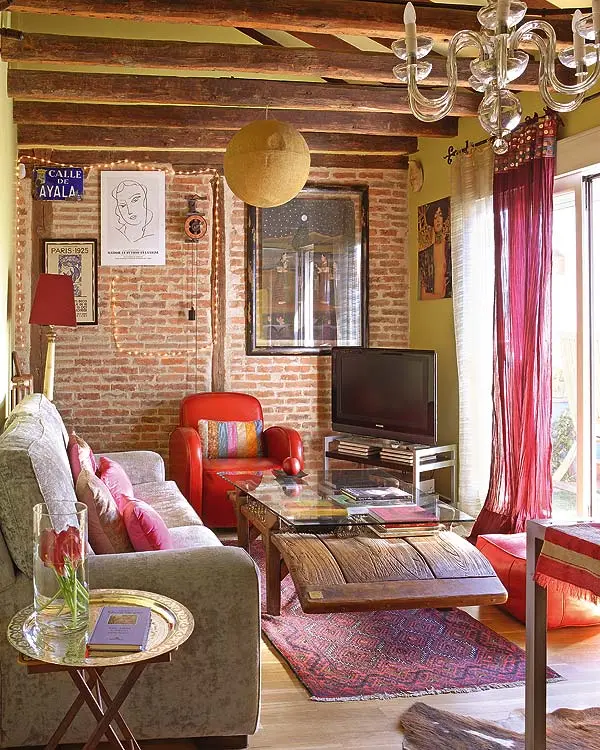 Pernele in culori aprinse, rosu, violet si mov, recreeaza atmosfera specifica anilor ’70 si ’80, dand un aer boem si hippy intregii camere