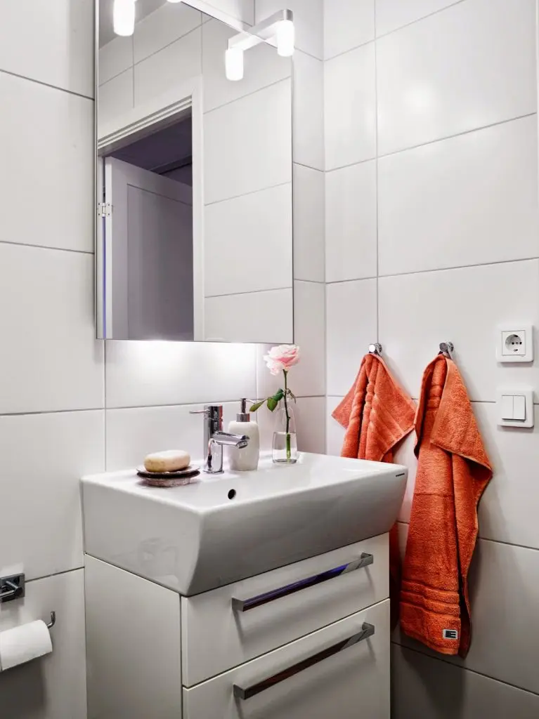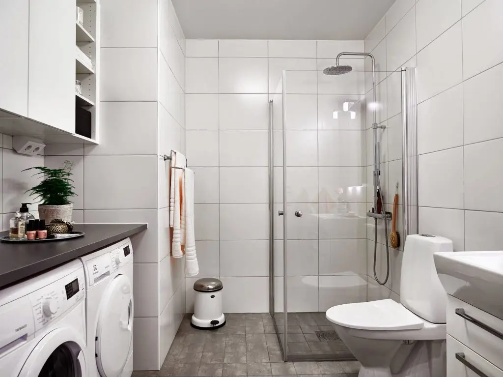 In baia moderna a apartamentului, lavoarul ofera in acelasi timp spatiu suficient pentru a depozita cea mai mare parte a lucrurilor, iar masina de spalat si uscatorul sunt acoperite de un blat gri.