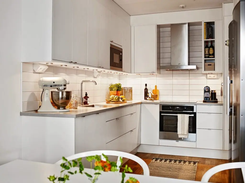 In spatiul bucatariei, care nu este vizibila din living, se intra prin zona diningului. Chiar daca apartamentul dispune de o bucatarie mica, aceasta este foarte functionala si cuprinde suficient spatiu pentru toate ustensilele si vasele necesare. Pentru a rezolva problema depozitarii, au fost montate dulapuri care pornesc din podea pana in tavan si au majoritatea electrocasnicelor incorporate.
