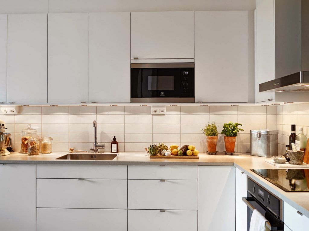 Mobilierul, pozitionat in forma de L, este vopsit integral in alb si asigura suficient spatiu pentru a gati in liniste.