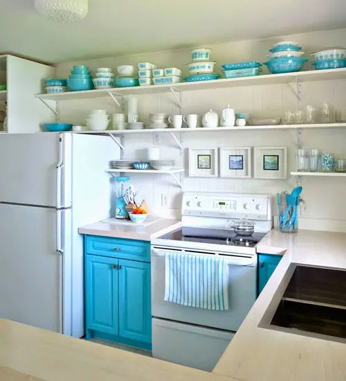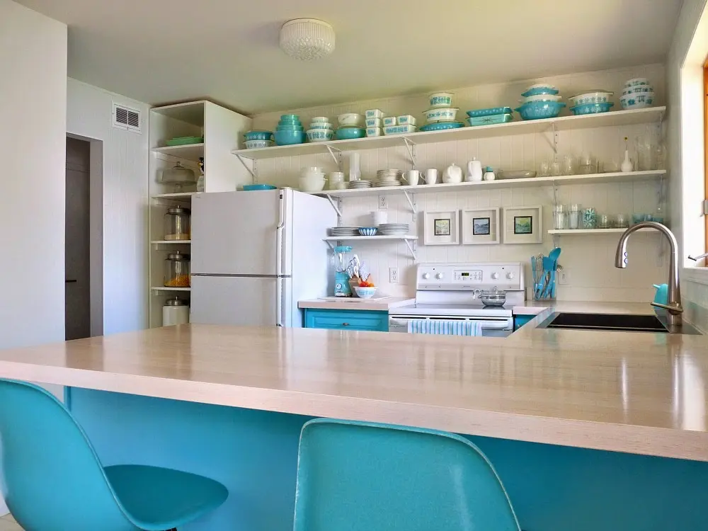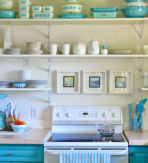 Schimbarea s-a produs la nivelul de organizare al dulapurilor in primul rand. Dulapurile din partea superioara au fost eliminate. Un placaj alb a luat locul vechilor flise. Etajerele si rafturile deschise permitand acum expunerea seturilor de farfurii, cesti, boluri, pahare si cani intr-un mod placut.