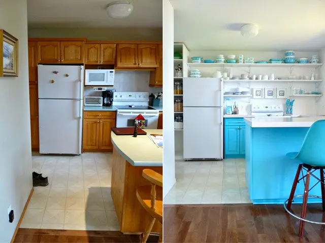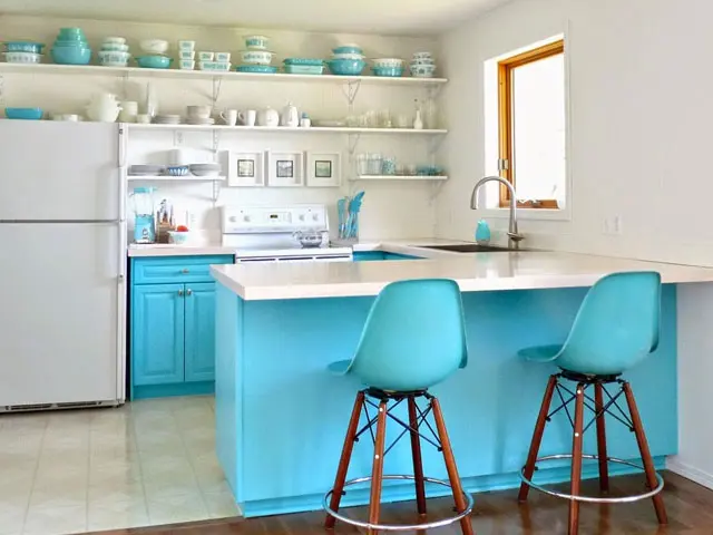 Dulapurile din partea inferioara au fost pastrate, dar vopsite in turcoaz, acestea fiind, de fapt culoarea predominanta de dupa renovare. Si scaunele (inlocuite cu unele noi) au primit aceeasi culoare pentru un plus de efect si coerenta la nivelul vizual.
