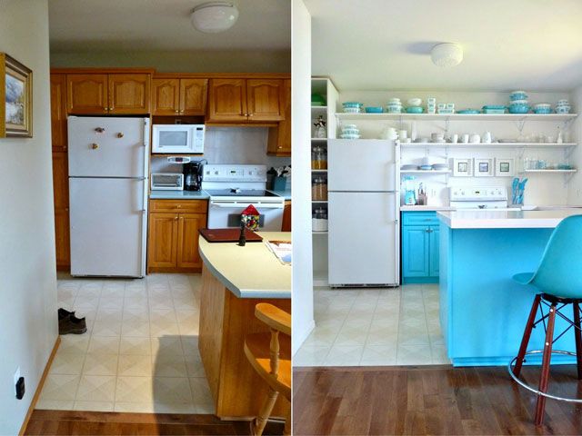 Dulapurile din partea inferioara au fost pastrate, dar vopsite in turcoaz, acestea fiind, de fapt culoarea predominanta de dupa renovare. Si scaunele (inlocuite cu unele noi) au primit aceeasi culoare pentru un plus de efect si coerenta la nivelul vizual.