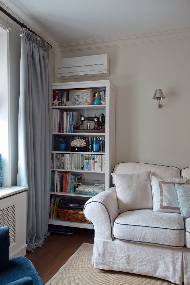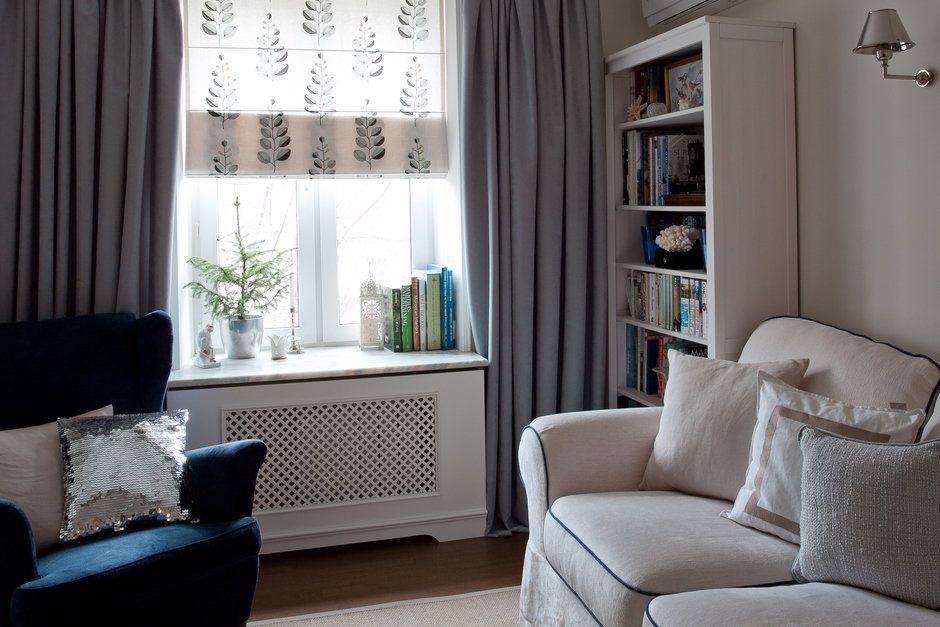 Pentru living, amenajarea pastreaza o simetrie prin cele doua corpuri de biblioteca dispuse de o parte si cealalta a canapelei. Fotoliul albastru asezat la fereastra paote fi locul perfect pentru lectura. Ca sa pastreze tonalitatea in spirit clasic a amenajarii, Olga a ales sa adauge o masca pentru a ascunde aspectul inestetic al caloriferului, largind in acelasi timp pervazul (excelent suport pentru carti, plante sau alte decoratiuni). Pentru a nu fragmenta prea mult spatiul apartamentului si a pastra continuitatea amenajarii, designerul a ales sa foloseasca acelasi tip de parchet pentru toate camerele, exceptie facand baia.