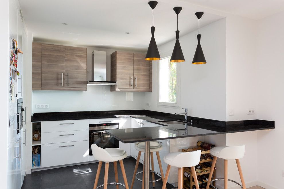 Bucataria este camera care ne incanta cel mai mult! Amenajarea armonioasa, culorile si texturile, imbinarea excelenta de stiluri rezulta intr-un spatiu functional, cu o eleganta discreta. Eliminand usa dinspre hol, designerul a optimizat perimetrul bucatariei. Astfel, au fost incluse mai multe dulapuri, iar electrocasnicele au putut fi incastrate. Spatiile de depozitare sunt generoase si a putut fi integrat si un loc dragut pentru luat masa. Legatura cu camera de zi se face printr-o usa culisanta.
