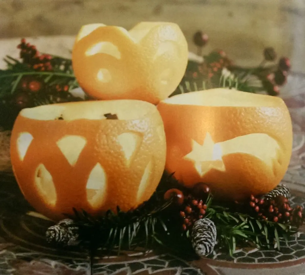 Se taie o bucata din partea de sus a portocalei astfel incat diametrul capacelului taiat sa corespunda cu cel al suportului de lumanare. Se scoare cu grija interiorul portocalei, umpland golul cu nisip, dupa care se asaza lumanarile. Cuisoarele se infig de jur imprejur in coaja alba a portocalei.