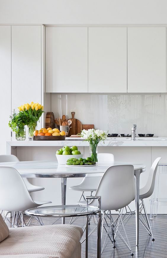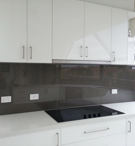 Amenajare unei bucatarii cu panou din sticla colorata intr-o nuanta de gri; datorita nuantei folosite se creeaza un centru de interes care iese in evidenta pe fundalul alb al mobilierului