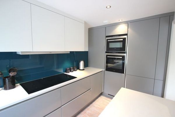 Bucatarie cu panou din sticla colorata o nuanta de albastru care se combina armonios cu griul discret al mobilierului