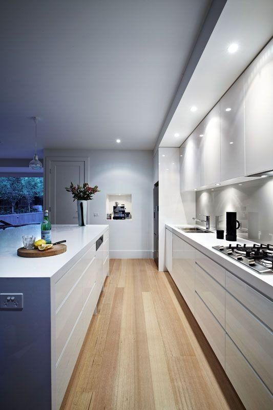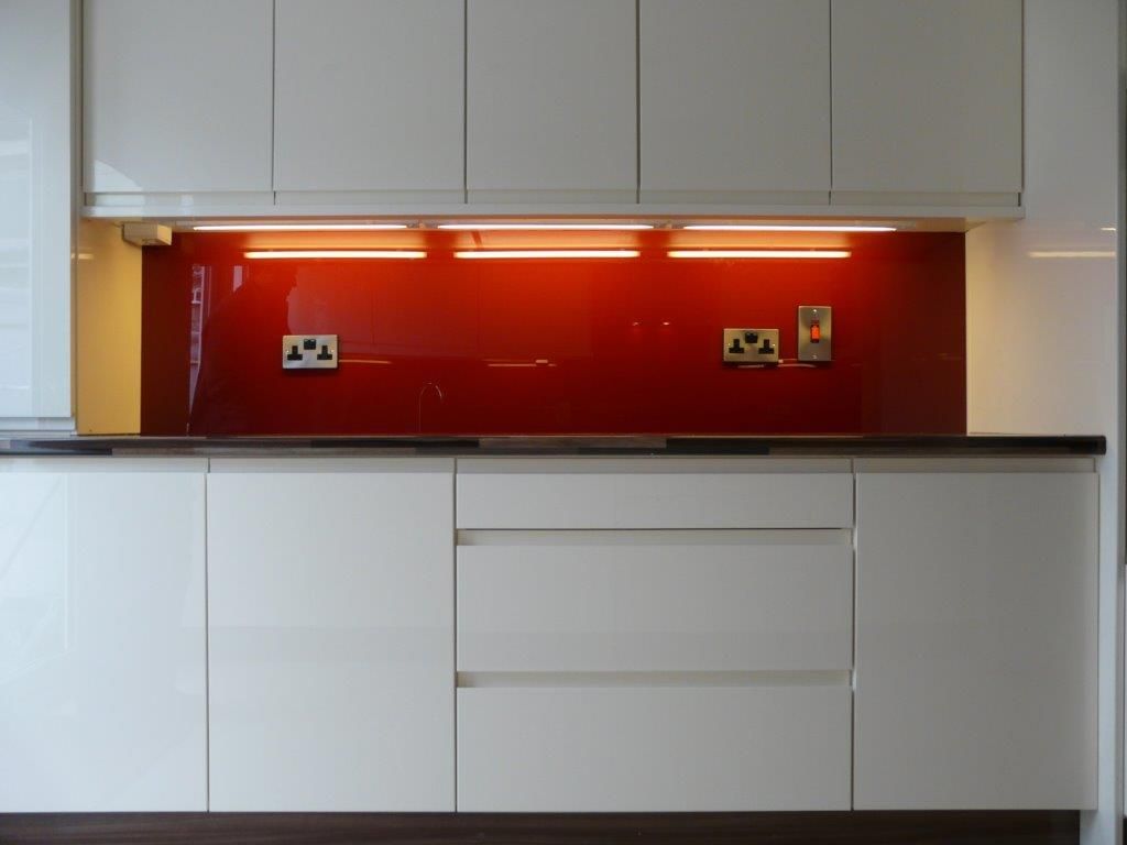 Bucatarie cu panou din sticla colorata un rosu intens pus in valoare de luminile montate sub dulapuri