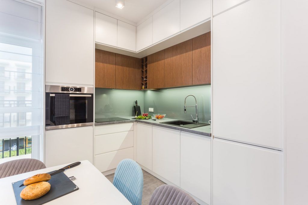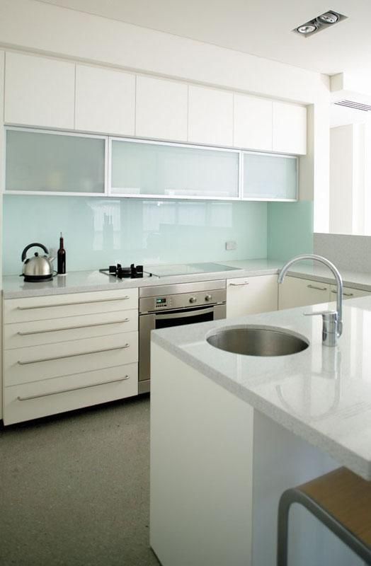Bucatarie cu panou din sticla colorata o nuanta foarte discreta de verde ce completeaza excelent cromatica neutra a amenajarii per ansamblu