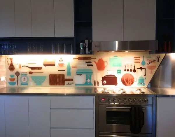 De cativa ani asistam la un nou trend in amenajarile de bucatarie panourile din sticla colorata folosite in locul clasicelor placi de faianta, in special pentru zona de bucatarie. Astfel, zona dintre dulapurile superioare si cele inferioare, aferenta zonei de gatit si blatului de lucru, se acopera cu un panou de sticla colorata sau imprimata digital cu o imagine preferata. Efectul per ansamblu este spectaculos, mai ales daca sticla este prevazuta cu lumini L ED integrate.