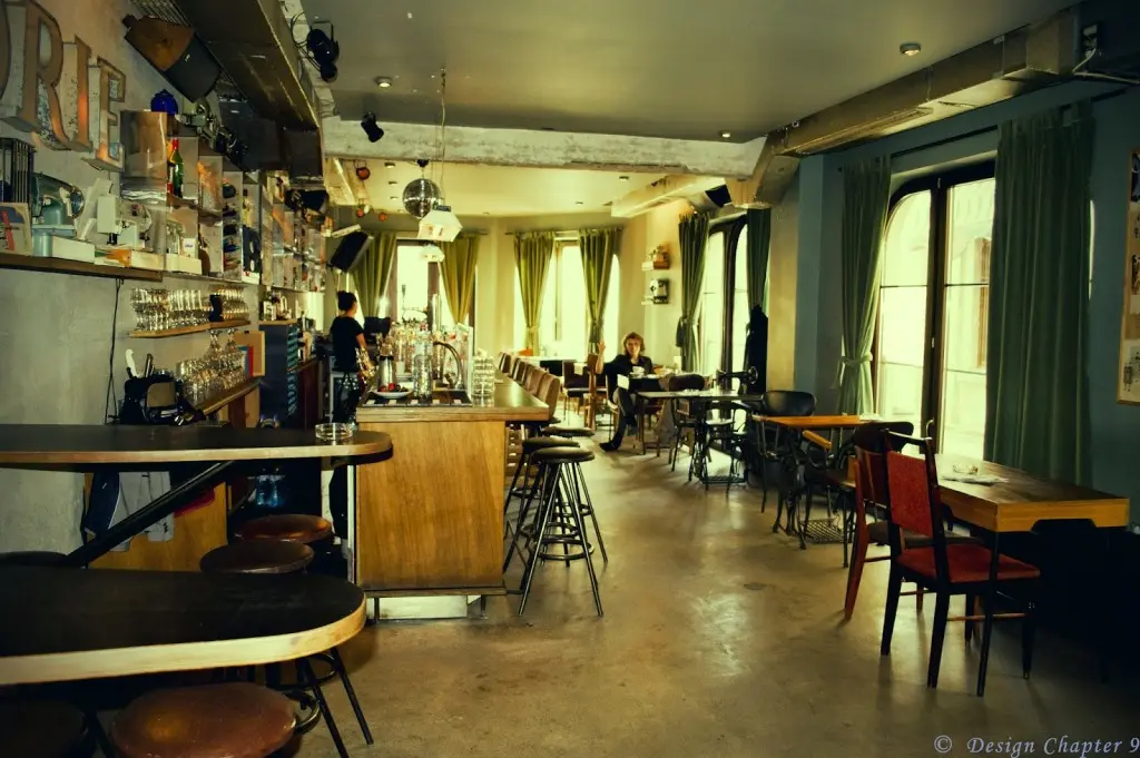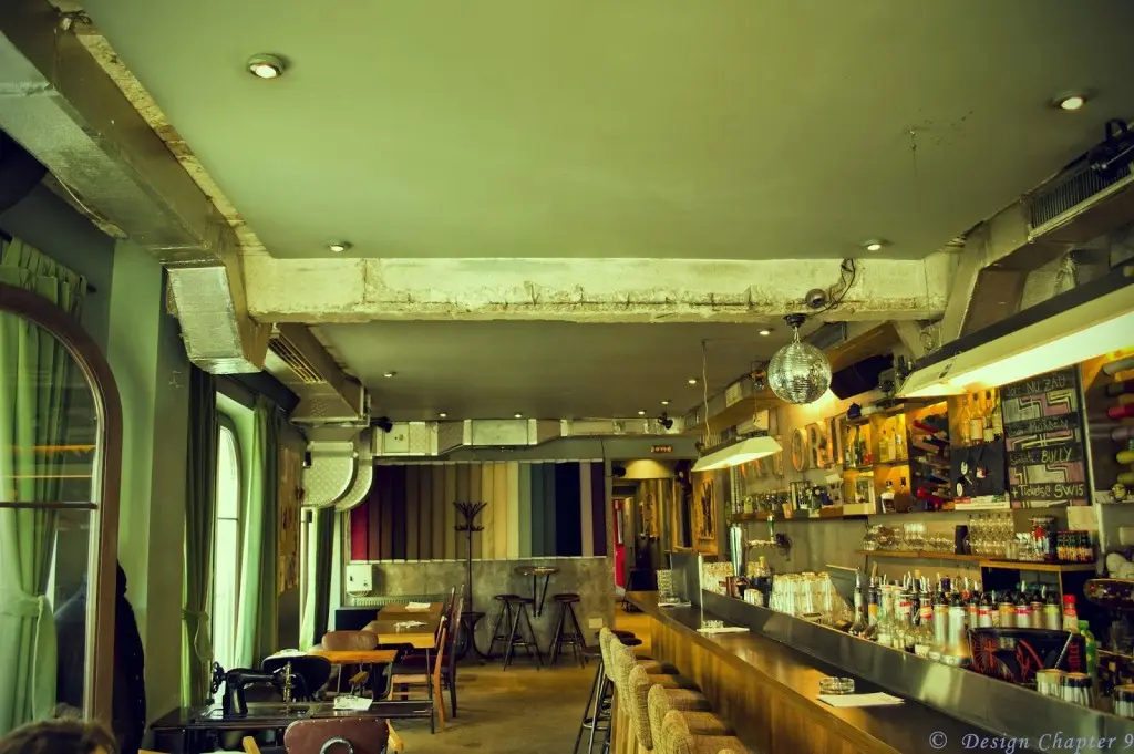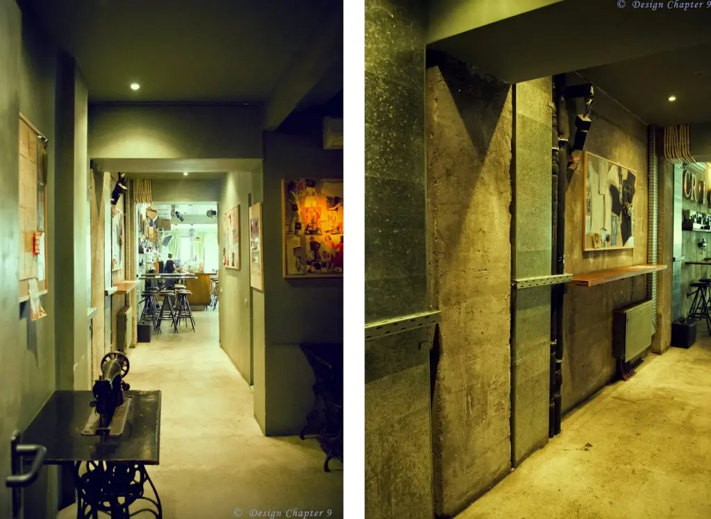 Barul este pozitionat de-a lungul spatiului, fiind si el foarte lung iar in spate se pot observa atarnate cateva papiote. Podeaua si peretii sunt finisate cu beton aparent, pentru a aduce putin din atmosfera austera a atelierelor de croitorie iar tavanul si stalpii sunt vopsiti in verde deschis.