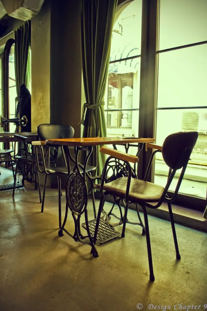 Inca de la intrare esti intampinat de mesele de cusut si poti observa ca spatiul este foarte lung si impanzit cu ferestre ce ofera o minunata priveliste spre Centrul Vechi. Cu toate acestea interiorul nu este foarte luminos ceea ce sporeste farmecul atmosferei de croitorie. Cum intri, in stanga, se afla cateva „mese de calcat” iar deasupra lor este montata sigla de la o croitorie comunista stirbita de cateva litere. Sub aceste litere, asezate pe o lunga polita troneaza cateva masini de cusut. Trebuie sa mentionez ca unele dintre piesele vechi sunt sunt obiecte personale ale proprietarelor: Andreea a adus o mașină de cusut din anii ‘60, iar Monica trei scaune din sufrageria din anii ’70 a bunicii ei, un fier de călcat și un telefon din plastic, cu disc.