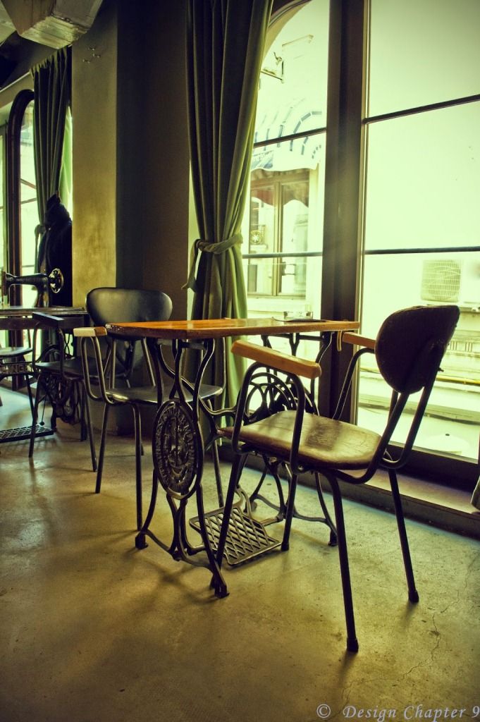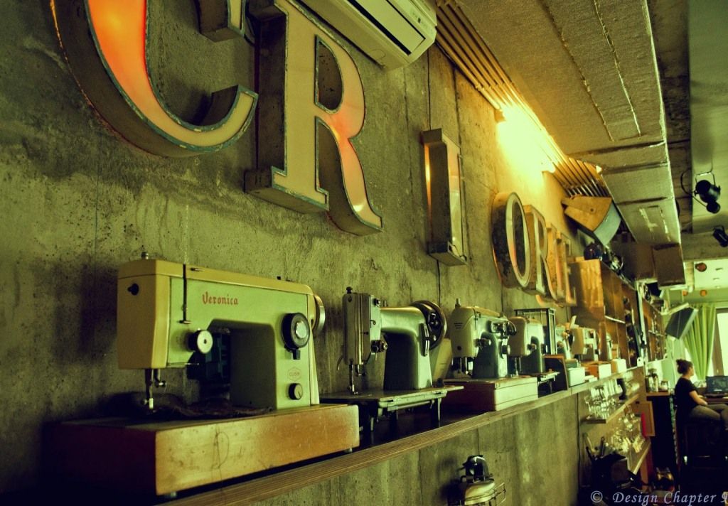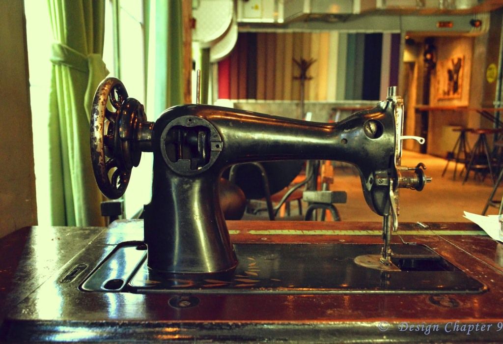 Inca de la intrare esti intampinat de mesele de cusut si poti observa ca spatiul este foarte lung si impanzit cu ferestre ce ofera o minunata priveliste spre Centrul Vechi. Cu toate acestea interiorul nu este foarte luminos ceea ce sporeste farmecul atmosferei de croitorie. Cum intri, in stanga, se afla cateva „mese de calcat” iar deasupra lor este montata sigla de la o croitorie comunista stirbita de cateva litere. Sub aceste litere, asezate pe o lunga polita troneaza cateva masini de cusut. Trebuie sa mentionez ca unele dintre piesele vechi sunt sunt obiecte personale ale proprietarelor: Andreea a adus o mașină de cusut din anii ‘60, iar Monica trei scaune din sufrageria din anii ’70 a bunicii ei, un fier de călcat și un telefon din plastic, cu disc.