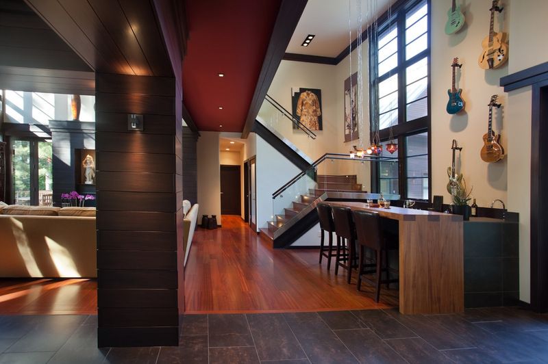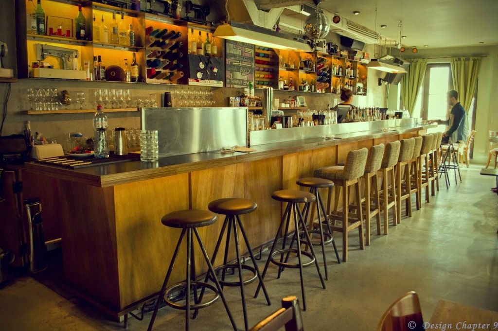 Barul este pozitionat de-a lungul spatiului, fiind si el foarte lung iar in spate se pot observa atarnate cateva papiote. Podeaua si peretii sunt finisate cu beton aparent, pentru a aduce putin din atmosfera austera a atelierelor de croitorie iar tavanul si stalpii sunt vopsiti in verde deschis.