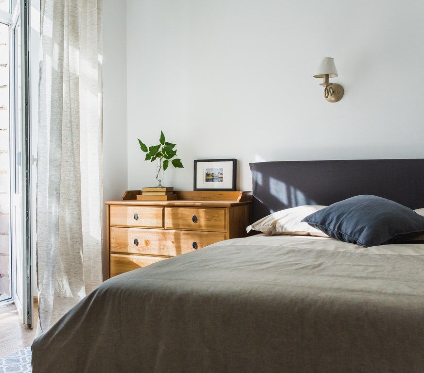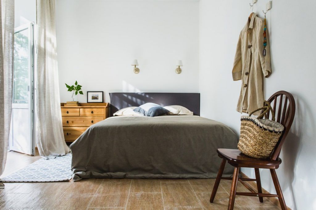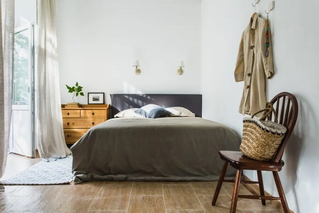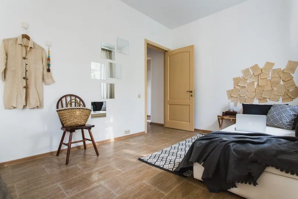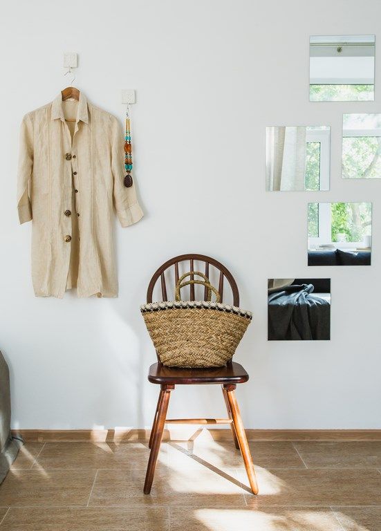 In coltul opus al camerei, este amenajat in mod firesc si patul. Comoda din lemn ne aminteste de piesele clasice asemanatoare unui scrin. Merge de minune cu lampadarul. Ingenioasa ideea celor 6 oglinzi in forma patrata asezate pe peretele opus ferestrei. Oglinzile reflecta exteriorul, minunate spatii verzi care imbogatesc astfel amenajarea de la interior.