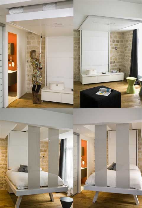 O varianta folosita cu succes este retractarea sau “disparitia” patului. Prin diverse mecanisme, suprafata de dormit este retrasa din zona initiala. Astfel, patul poate fi ridicat pana in tavan, lasand spatiul atat de necesar pentru alte activitati cotidiene. Pentru a nu crea un efect vizual neplacut, partea care ramane vizibila din pat poate fi integrata in tavan ca un spatiu pentru spoturi sau cu un mini decor.