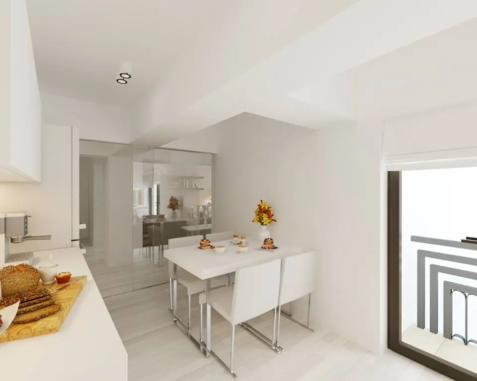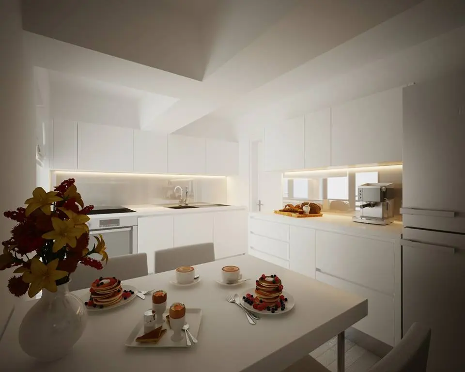 Materialele alese cu grija ale finisajelor si ale mobilei ofera acestei bucatarii un aer foarte cosy. Designul mobilierului este simplu si cursiv, nelipsind insa accesoriile gratioase in acord cu stilul minimalist. Asa cum era si normal pentru orice bucatarie moderna, mobilierul incorporeaza aragazul si frigiderul, iar dulapurile albe si simple, montate in perete, accentueaza designul minimal al incaperii. Sub acestea au fost montate niste surse de iluminat care creeaza un efect foarte placut atunci cand sunt aprinse.