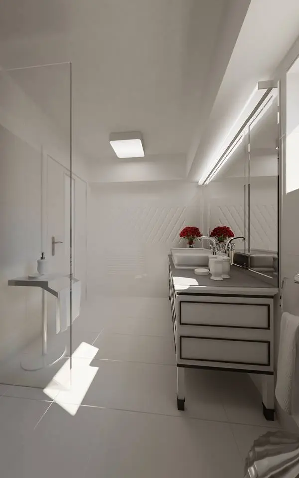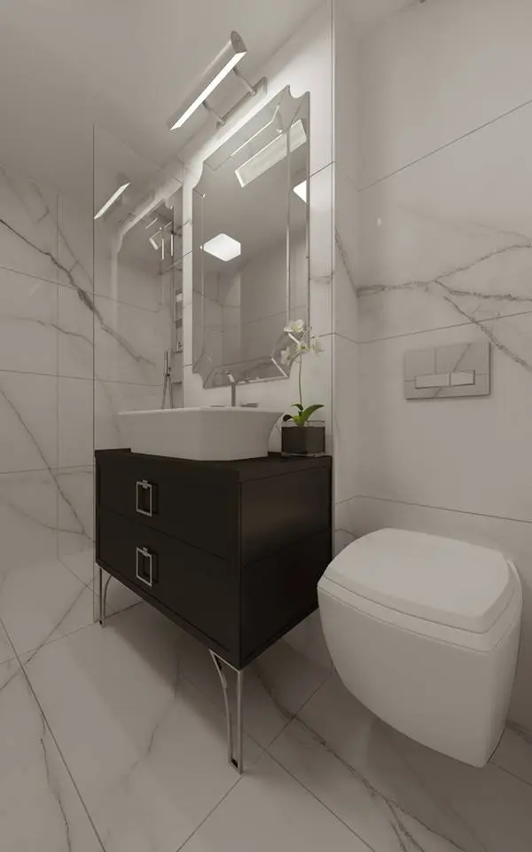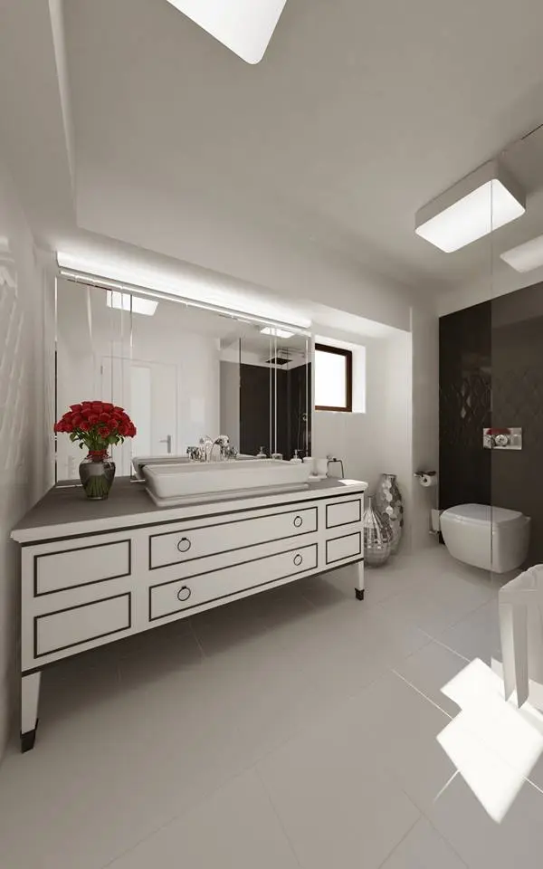Una din bai este in totalitate placata cu marmura alba. Se poate observa grija arhitectilor pentru anumite detalii, care pe langa eleganta, au urmarit ca materialele folosite sa necesite minimum de intretinere.