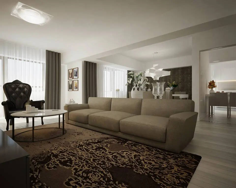 Living-ul este foarte incapator si are o oarecare nota de opulenta date de accesoriile din decor: un scaun de piele, masuta de cafea cu un blat alb, o canapea bej foarte mare, iar in zona de dinig aflandu-se o lustra care atrage toate privirile prin forma ei neobisnuita.
