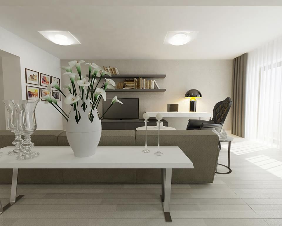 Living-ul este foarte incapator si are o oarecare nota de opulenta date de accesoriile din decor: un scaun de piele, masuta de cafea cu un blat alb, o canapea bej foarte mare, iar in zona de dinig aflandu-se o lustra care atrage toate privirile prin forma ei neobisnuita.