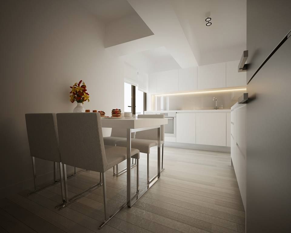 Materialele alese cu grija ale finisajelor si ale mobilei ofera acestei bucatarii un aer foarte cosy. Designul mobilierului este simplu si cursiv, nelipsind insa accesoriile gratioase in acord cu stilul minimalist. Asa cum era si normal pentru orice bucatarie moderna, mobilierul incorporeaza aragazul si frigiderul, iar dulapurile albe si simple, montate in perete, accentueaza designul minimal al incaperii. Sub acestea au fost montate niste surse de iluminat care creeaza un efect foarte placut atunci cand sunt aprinse.